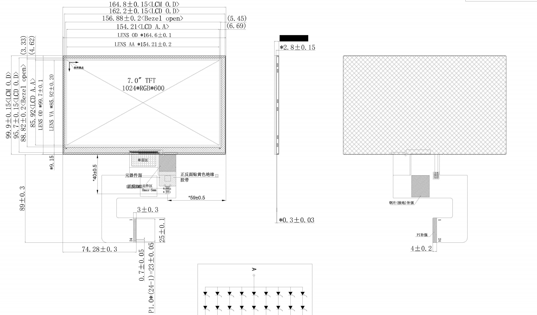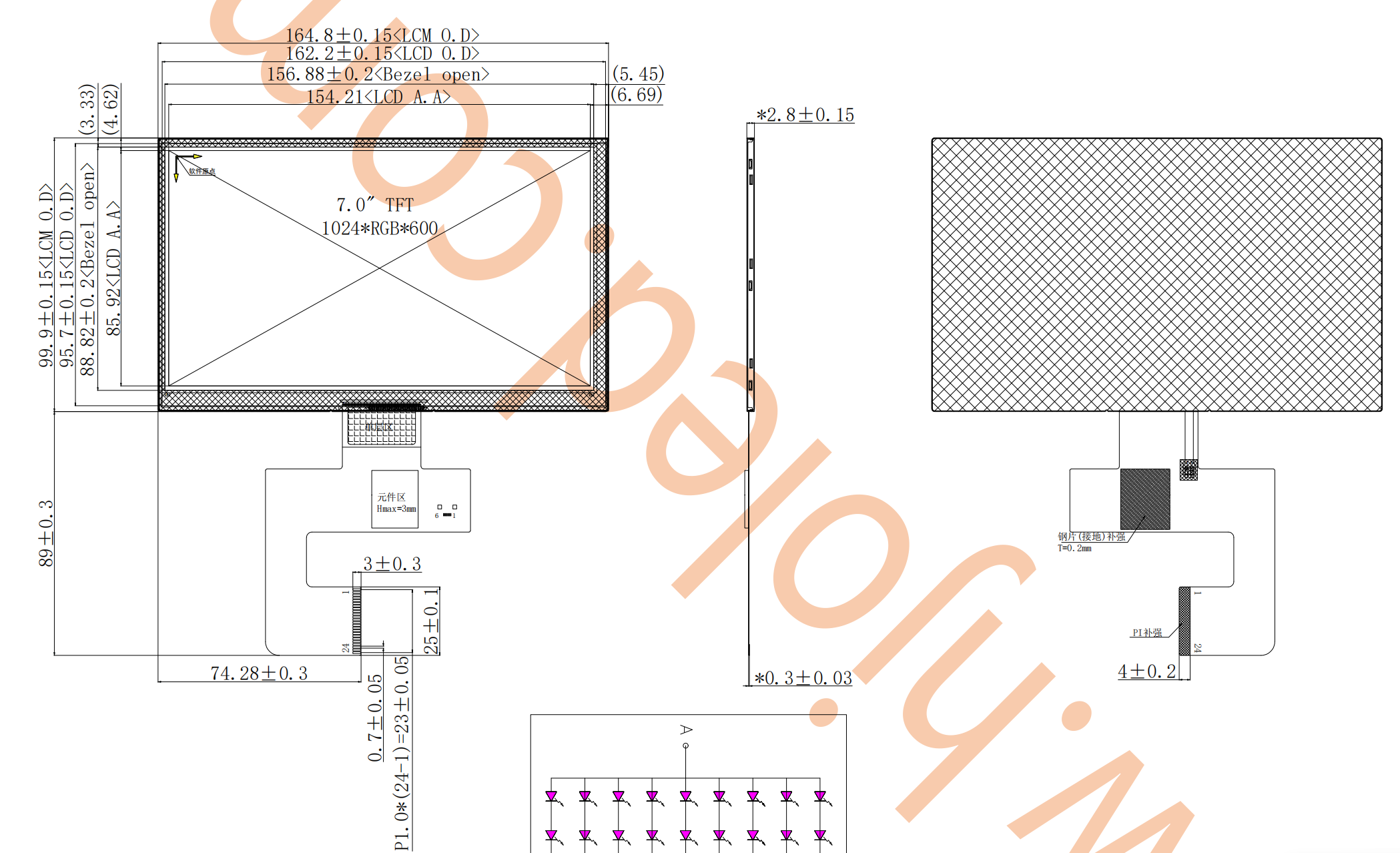 7 tuuman TFT-vaakanäytöissä on yleensä 1024*600 resoluutio ja 4-kanavainen MIPI-liitäntä. 2-kanavaiset LCD-näytöt ovat harvinaisia, ja ne, joissa on integroitu kapasitiivinen kosketusnäytön kaapeli LCD-näytön kaapeliin, ovat vielä harvinaisempia, mikä lisää laitteistoinsinöörien työtaakkaa. Shenzhen Hongjia Technologyn insinöörit ovat onnistuneesti tuottaneet 7 tuuman IPS-maisemanäytöt, joissa on 1024*600 resoluutio, 2-kanavainen MIPI-liitäntä ja kapasitiivinen kosketusnäyttö. 24-PIN-liitin yhdistää kosketusnäytön ja näytön signaalit yhdellä kaapeliliitännällä asiakkaan suunnittelun helpottamiseksi.